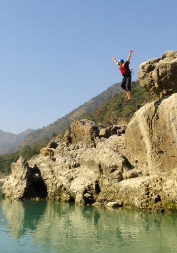 Geography of Rishikesh lends itself conveneintly for Adventure Sports. Cliff Diving is one such activity which possible only because of City's geography. Rishkesh is having a distinction of a place where ganges enters the planes after travelling around 250 kms. in rugged tarrain of himalayas. Just 4-5 Kms upstream from Rishikesh there are many rocks and boulders intruding in ganages from it's banks which makes it a natural choice for cliff diving.